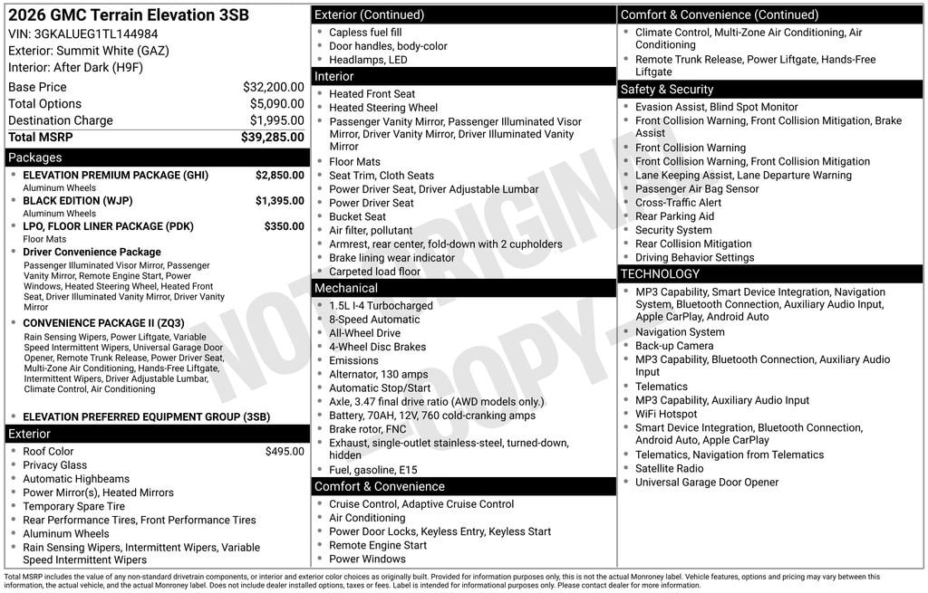 125 point inspection, Terrain Elevation, 4D Sport Utility, 1.5L DOHC, 8-Speed Automatic with Overdrive, AWD, Summit White, After Dark Cloth, 2-Way Power Driver Lumbar Seat Adjuster, 3-Channel Programmable Universal Home Remote, 4-Wheel Disc Brakes, 6 Speakers, 6-Speaker Audio System Feature, 8-Way Power Driver Seat Adjuster, ABS brakes, Air Conditioning, All-Weather Cargo Mat (LPO), Alloy wheels, AM/FM radio: SiriusXM, Auto High-beam Headlights, Automatic temperature control, AutoSense Hands-Free Power Programmable Liftgate, Black Edition, Black Exterior Accents & Black Exterior Badging, Black Mirror Caps, Brake assist, Brushed Aluminum Roof Rails, Bumpers: body-color, Cabin Humidity & Windshield Temperature Sensor, Compass, Convenience Package II, CoreTec Seat Trim, Darkened Grille & C Shaped Surrounding Bezel, Delay-off headlights, Driver & Front Passenger Heated Seats, Driver 6-Way Manual Seat Adjuster, Driver door bin, Driver vanity mirror, Dual front impact airbags, Dual front side impact airbags, Dual-Zone Automatic Climate Control, Ebony Twilight Metallic Roof, Electronic Stability Control, Elevation Premium Package, Emergency communication system: OnStar and GMC connected services capable, Floor Liner Package (LPO), Four wheel independent suspension, Front All-Weather Floor Liners (LPO), Front anti-roll bar, Front Intermittent RainSense Wipers, Front Passenger 4-Way Manual Seat Adjuster, Front reading lights, Fully automatic headlights, Gloss Black Roof-Mounted Side Rails, Heated door mirrors, Heated front seats, Heated steering wheel, Heated Wiper Park, Illuminated entry, Low tire pressure warning, Navigation System, Occupant sensing airbag, Outside temperature display, Overhead airbag, Overhead Sunglass Storage, Panic alarm, Passenger door bin, Passenger vanity mirror, Power door mirrors, Power steering, Power windows, Preferred Equipment Group 3SB, Premium Cloth Seat Trim, Radio data system, Radio: Premium GMC Infotainment System, Rear air conditioning, Rear anti-roll bar, Rear seat center armrest, Rear window defroster, Rear window wiper, Remote keyless entry, Second Row All-Weather Mat (LPO), Security system, SiriusXM w/360L Trial Subscription, Speed control, Speed-sensing steering, Split folding rear seat, Spoiler, Sport steering wheel, Steering wheel mounted audio controls, Tachometer, Telescoping steering wheel, Tilt steering wheel, Traction control, Trip computer, Variably intermittent wipers, Wheels: 19 Gloss Black Painted Aluminum, Wireless Apple CarPlay/Wireless Android Auto, Wireless Phone Charging for Portable Devices.